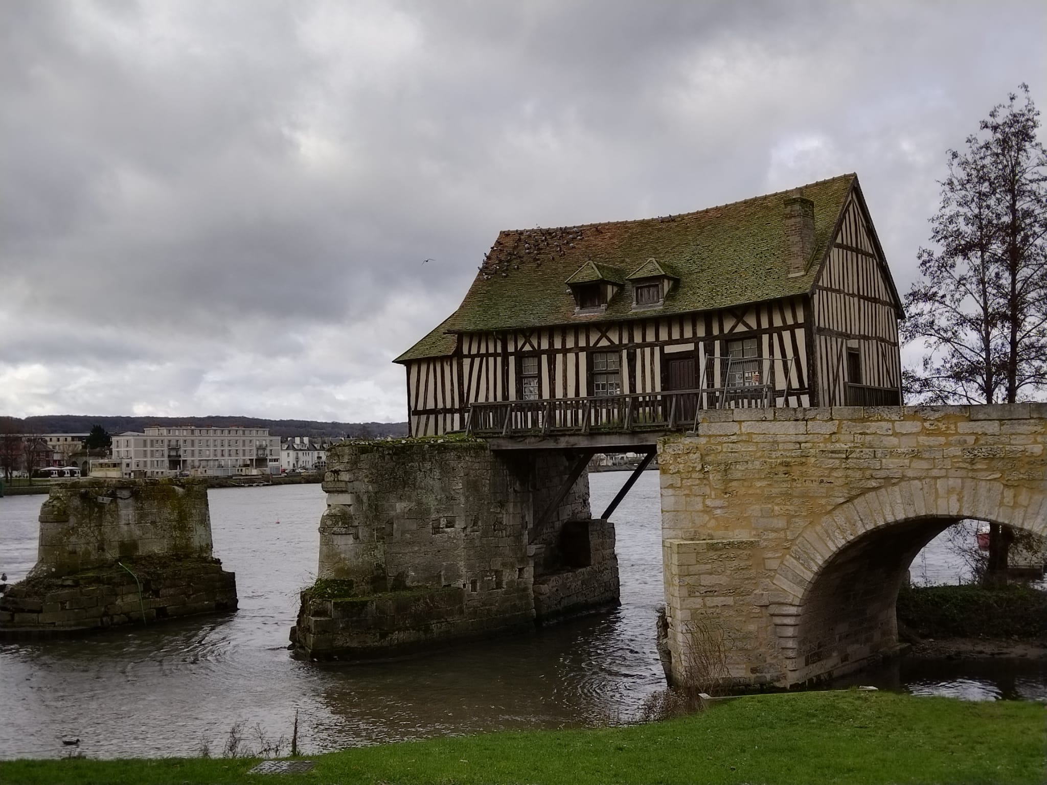 Vernon ha un grazioso centro storico con zona pedonale dove scoprire, nei suoi vicoli e strade, le tipiche case normanne e, di fronte all’Hotel de Ville, la Collégiale Notre-Dame che conserva parti dell’XI secolo. Passando il ponte sulla Senna poi si stagliano “le Chateau de la Tourelle et le Vieux Moulin” da dove partono i sentieri e le piste ciclabili lungo la Senna. Il Vieux Moulin risale al 1566 ed era stato costruito sul quarto arco del ponte vicino al castello ed era in uso fino al XIX secolo quando l’ultimo mugnaio, Duvivier, chiuse l’attività e la costruizione fu adibita solamente ad abitazione perdendo la ruota che azionava le mole. Il mulino viene comprato poi nel 1930 da un americano di Boston che non cura l’edificio, rovinato e saccheggiato in seguito durante la seconda guerra mondiale; negli anni Settanta rischiava di crollare e così la municipalità lo ha restaurato. Immagino il luogo, ideale per passeggiate e pic nic durante la bella stagione e penso al meraviglioso progetto del sindaco e del presidente del dipartimento dell’Eure di continuare la pista ciclabile che passa sotto il mulino e che dovrebbe legare Parigi al mare in 440 chilometri seguendo il percorso della Senna.