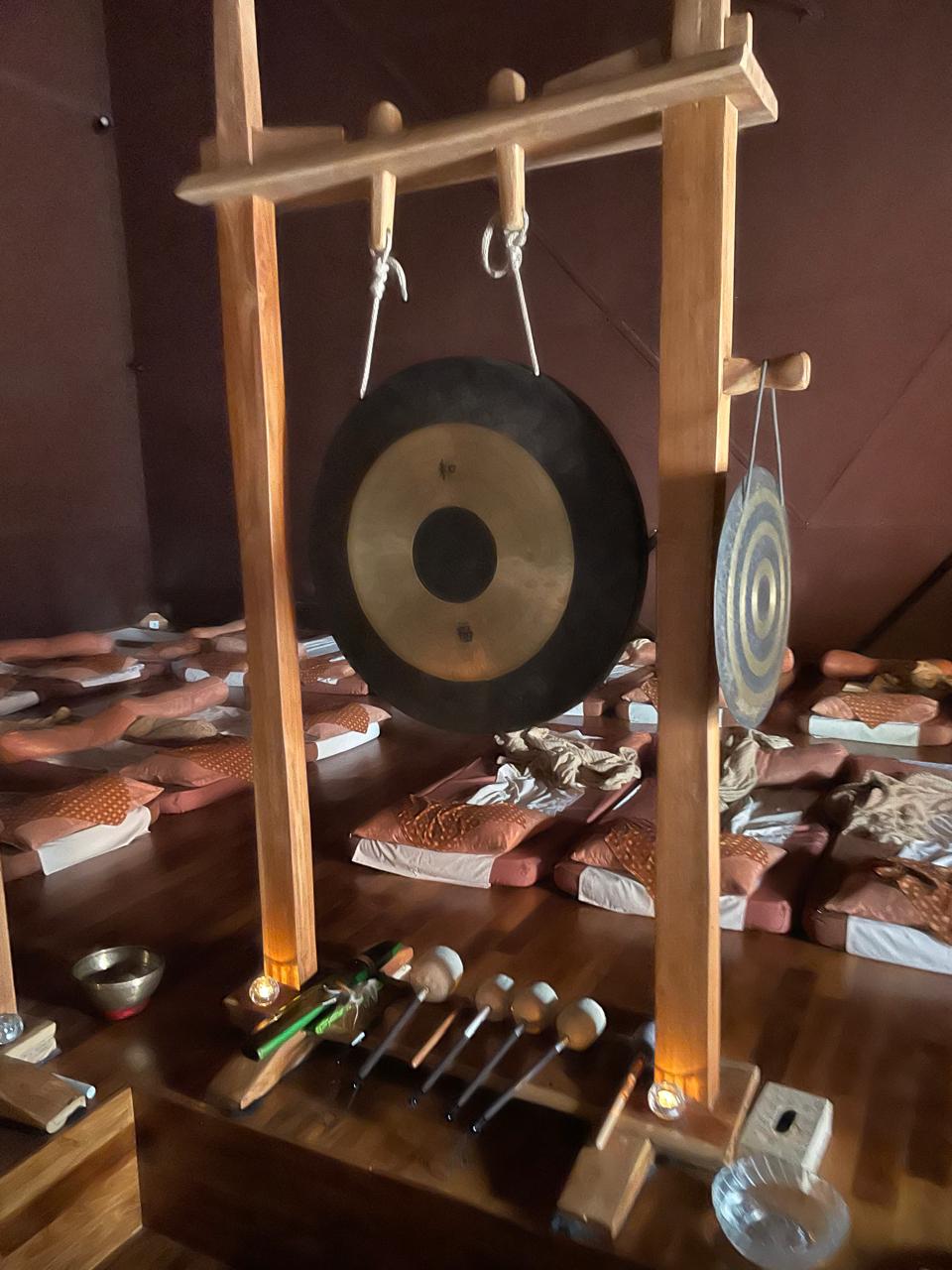 Il suono di un gong ci avvisa dell’inizio della nostra pratica ed entriamo in una piramide. Ci sdraiamo su dei tappetini, chiudiamo gli occhi e, cosa fondamentale, siamo pronte per aprire cuore e mente a questa esperienza.