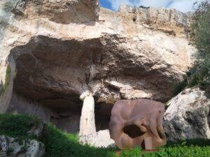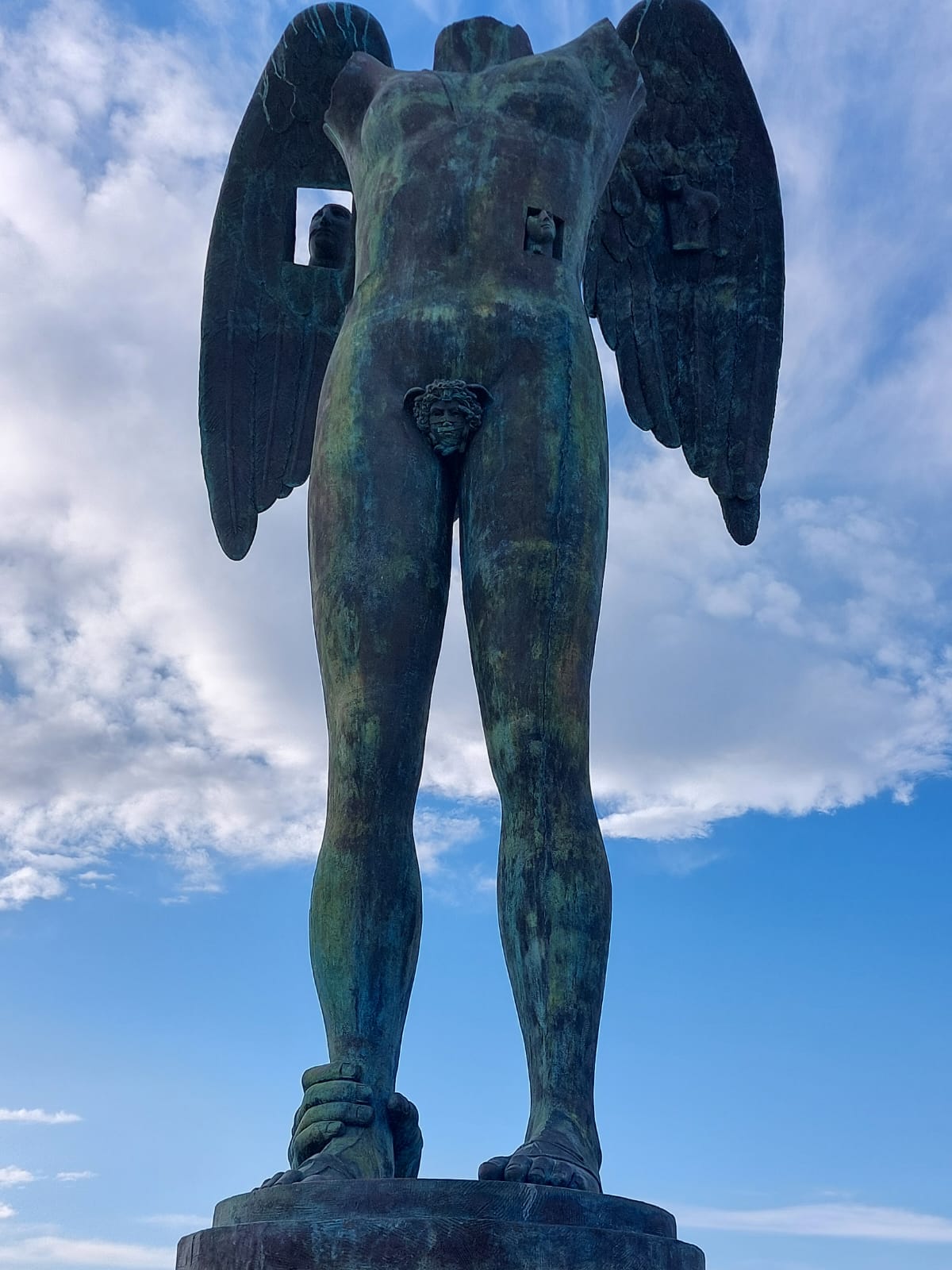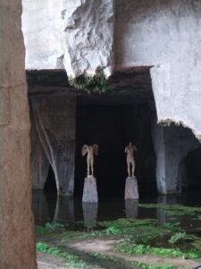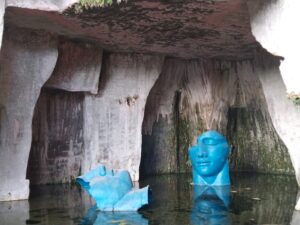 Tra le vestigia del sito sono disposte 27 statue di Igor Mitoraj per la più grande mostra scultorea mai realizzata: Lo sguardo: Humanitas e Physis. Già sull’Etna avevamo ammirato la testa di Teseo e a Ortigia, di fronte al castello Maniace, l’imponente scultura di Ikaria, versione femminile di Icaro, rappresentata con una mano che la trattiene alla caviglia e un’apertura nel fianco da dove una testa guarda verso il mare. Queste statue mi intrigano e incuriosiscono e leggo sull’opuscolo scaricato con il QR che le sculture, i busti, le teste, vogliono suscitare emozioni e significati integrandosi con i luoghi. L’Humanitas richiama la virtù dell’umanità e della civiltà con i suoi valori e la sua visione dell’uomo nella società civile. Uno scenario nel quale la Physis- la natura per i Greci- è principio e causa di tutte le cose e ci riporta nella dimensione del divenire del mondo nel quale recuperare i significati profondi della relazione tra uomo e ambiente naturale. Questo “sguardo” riconduce all’armonia dei principi vitali degli elementi: terra, acqua, fuoco, aria; elementi che il Maestro integra nelle sue opere. La Terra per i materiali che privilegia: il marmo e il bronzo, il Fuoco, indispensabile nella fusione dei metalli, l’Acqua del mare che fa da scenario alle opere e l’Aria, indispensabile alla vita e verso quale tendono le statue alate. E’ uno sguardo verso il Mediterraneo su cui i palcoscenici dei teatri greci si affacciano per rappresentare la drammaturgia umana.