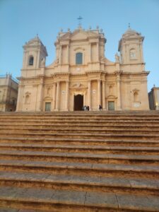 Decidiamo di andare a visitare la città di Noto dove gustiamo una meravigliosa zuppa di mandorle calda che, in questo freddo pomeriggio invernale, ci risveglia le papille gustative. Percorriamo il Corso e ci gustiamo la Capitale del Barocco, patrimonio dell’Umanità dal 2002, dall’esterno: la Cattedrale San Nicolò, la Basilica San Salvatore e il Palazzo Ducezio sono chiusi ma il colore caldo della pietra locale, con gli ultimi raggi del sole sfuma dall’oro al rosa e si percepisce l’atmosfera magica di questa città.