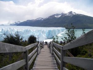 Giorni dopo il nostro arrivo ci spostiamo nella città di Calafate, base abituale per esplorare la regione dei grandi laghi, che sorge sulle rive del Lago Argentino, il più grande (ha una superficie di 1415 Km) e il più australe dei laghi patagonici, nel settore sudest della provincia di Santa Cruz, al limite col Cile. Il lago ha un corpo principale e due lunghi e irregolari bracci che si estendono per quello che viene chiamato Parco nazionale I Ghiacciai. Per la sua imponente bellezza naturale è una meraviglia unica al mondo e l’UNESCO lo ha proclamato nel 1981 Patrimonio mondiale dell’umanità. Il Parco offre uno scenario di montagne, laghi, boschi incontaminati e include una vasta parte della Cordigliera delle Ande coperta di neve e gelo ad ovest e l’arida steppa patagonica ad est. Il suo nome è dovuto alla presenza di numerosi ghiacciai che si originano nel grande Campo di Gelo Patagonico, il manto di ghiaccio più grande del mondo dopo l’Antartide. La cosa sorprendente di questo manto è che di solito nel nostro pianeta può incontrarsi a più di 2500 metri sul livello del mare mentre nella provincia di Santa Cruz ha origine a 1500 metri di altitudine e scende fino a 200 metri sul mare, permettendo agli uomini un accesso e una visione unica al mondo.