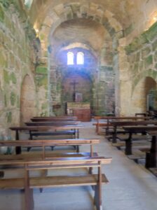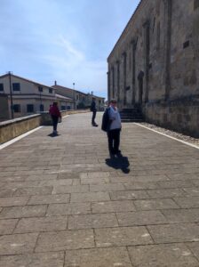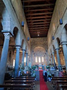 La prima tappa ci ha portati alla Basilica di Santa Giusta, che ci ha accolto su un colle. Costruita tra il 1135 e il 1145, sembra un ponte verso un tempo sospeso. Le sue tre navate raccontano secoli di storia: colonne una diversa dall’altra, capitelli che parlano latino, e un soffitto ligneo che invita a guardare in alto. Ma è nella cripta, interamente scavata nella pietra, che si coglie l’anima del luogo: un ventre sacro che custodisce le reliquie delle sante Giusta, Giustina ed Enedina.
