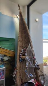Dopo la basilica, il nostro cammino ci ha condotti alla ricerca delle fassonis, le barche d’erba che per secoli hanno solcato questi stagni. Purtroppo non siamo riusciti a vederne neanche una, se non in qualche illustrazione davanti a dei negozi, Non era la loro stagione, ma ci ripromettiamo di tornare a vederle in epoche più propizie. Costruite con fieno palustre e giunchi, le fassonis sono simili ai caballitos de totora del Perù (io ed i miei amici avevamo navigato su una imbarcazione simile sul lago Titicaca) o alle barche del Nilo, e testimoniano un legame profondo tra uomo e natura. Ogni anno, ad agosto, tornano vive nella Regata de Is Fassonis, danzando sull’acqua tra mito e realtà.