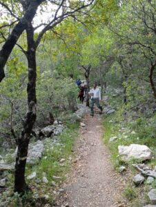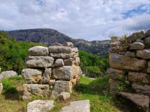 Superato l’elegante Hotel Su Gologone (sì, c’erano davvero maialini allo spiedo e Marinella, incantata dal lusso dell’albergo, ha chiesto di visitare le stanze per parenti “fantasma”), ci siamo inoltrati su una strada sterrata che porta alla Valle di Lanaittu. La vegetazione fitta, i lecci e gli olivastri sembravano volerci accogliere. Solo il vento e qualche uccello interrompevano il silenzio. Alla fine del sentiero, un cancello nel tempo: il sito archeologico di Sa Sedda ‘e Sos Carros. Questo luogo incantato risale al XIII secolo a.C.: un villaggio nuragico fatto di capanne di pietra, luoghi sacri e storie millenarie. Il nome significa “il passaggio dei carri”, ma il sito racconta molto di più.