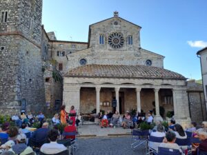 e con la lettura di brani delle opere selezionate, e culmina con la consegna dei premi, ispirati al ‘rosone della Collegiata’. Di fronte alla chiesa romanica l’atmosfera nell’incantevole piazza si anima e si estende ai vicoli del borgo che regalano scorci sorprendenti verso il palco, i tavoli imbanditi, lo storico palazzo del comune, dove spesso si allestiscono mostre.