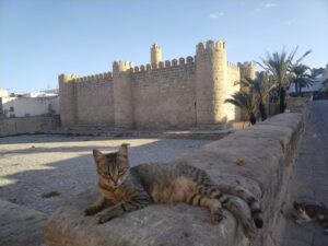 En longeant la côte, on arrive à Sousse. Ici, le charme de la Méditerranée rencontre une histoire millénaire. Fondée par les Phéniciens puis développée par les Romains sous le nom d’Hadrumetum, Sousse a été pendant des siècles un important centre commercial. Aujourd’hui encore, cet héritage est visible dans les vestiges archéologiques et les mosaïques conservés au Musée archéologique de Sousse. Comme toutes les villes du Maghreb, son cœur battant est sa médina, classée au patrimoine de l’UNESCO, un dédale de ruelles, de souks et d’architecture islamique. On y trouve des monuments emblématiques tels que le Ribat de Sousse et la Grande Mosquée, témoins de la période aghlabide. Se promener dans les souks est une expérience sensorielle : épices, tissus, artisanat local racontent une tradition toujours vivante. Je discute avec le coiffeur chez qui j’ai décidé de m’arrêter de la vie quotidienne dans cette ville, je déguste des plats typiques et je flâne dans le souk avant de sortir des remparts et de me diriger vers la mer pour un thé « les pieds dans l’eau ». Les plages de Sousse, comme celle de Boujaafar, offrent du sable doré et des eaux limpides. Le soir, c’est plutôt la nouvelle ville qui semble vibrer, tandis que dans la médina, à la fermeture du souk, les chats deviennent les maîtres des rues.